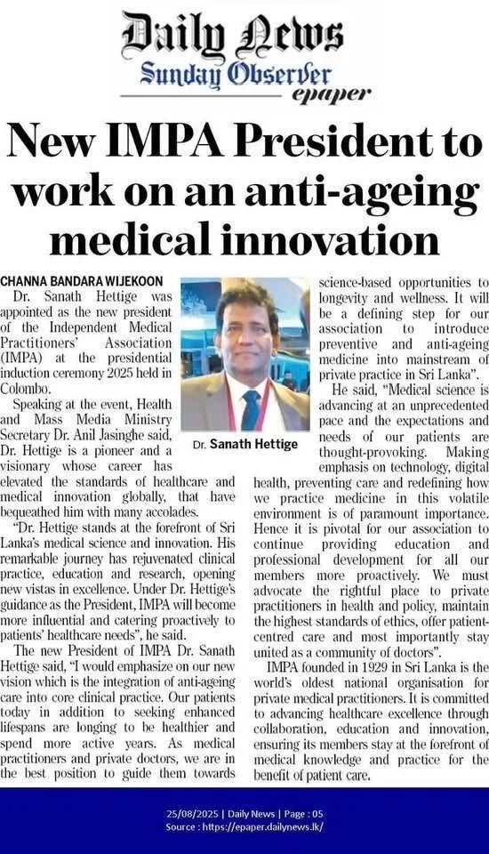 Dr Hettige was elected as the president of IMPA ( Independant medical practitioner’s association) of Sri Lanka which is the oldest private medical association in the world estabilished in the year 1929.